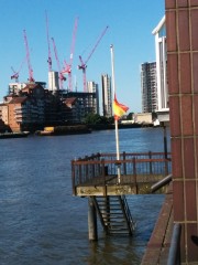 08:38:30 In the morning I went for a walk, across the other side of the river to Vauxhall to buy things for breakfast from the Little Waitrose. The sun was gleaming on the water rather pleasantly. | 08:55:39 Not the most attractive stretch of the Thames, but it looked quite nice today. | 09:00:37 The Spanish flag outside Tyburn House. | 09:47:02 Erika and a croissant. |