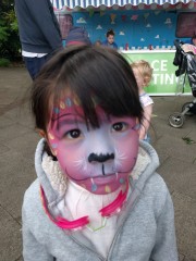 12:02:24 At the zoo, Erika got her face painted as usual. | 12:07:54 Erika on the carousel, hard to see as she was on one of the inside horses. | 12:10:33 Erika stomping about and roaring a bit. | 12:10:38 Roar! |