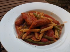 For dinner, pasta with veggie chorizo sausages, tomato and green beans.