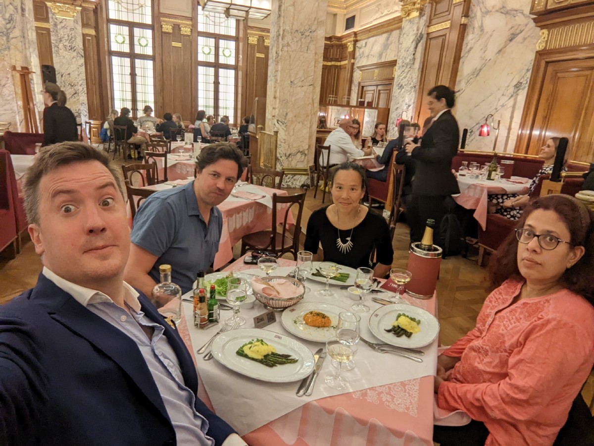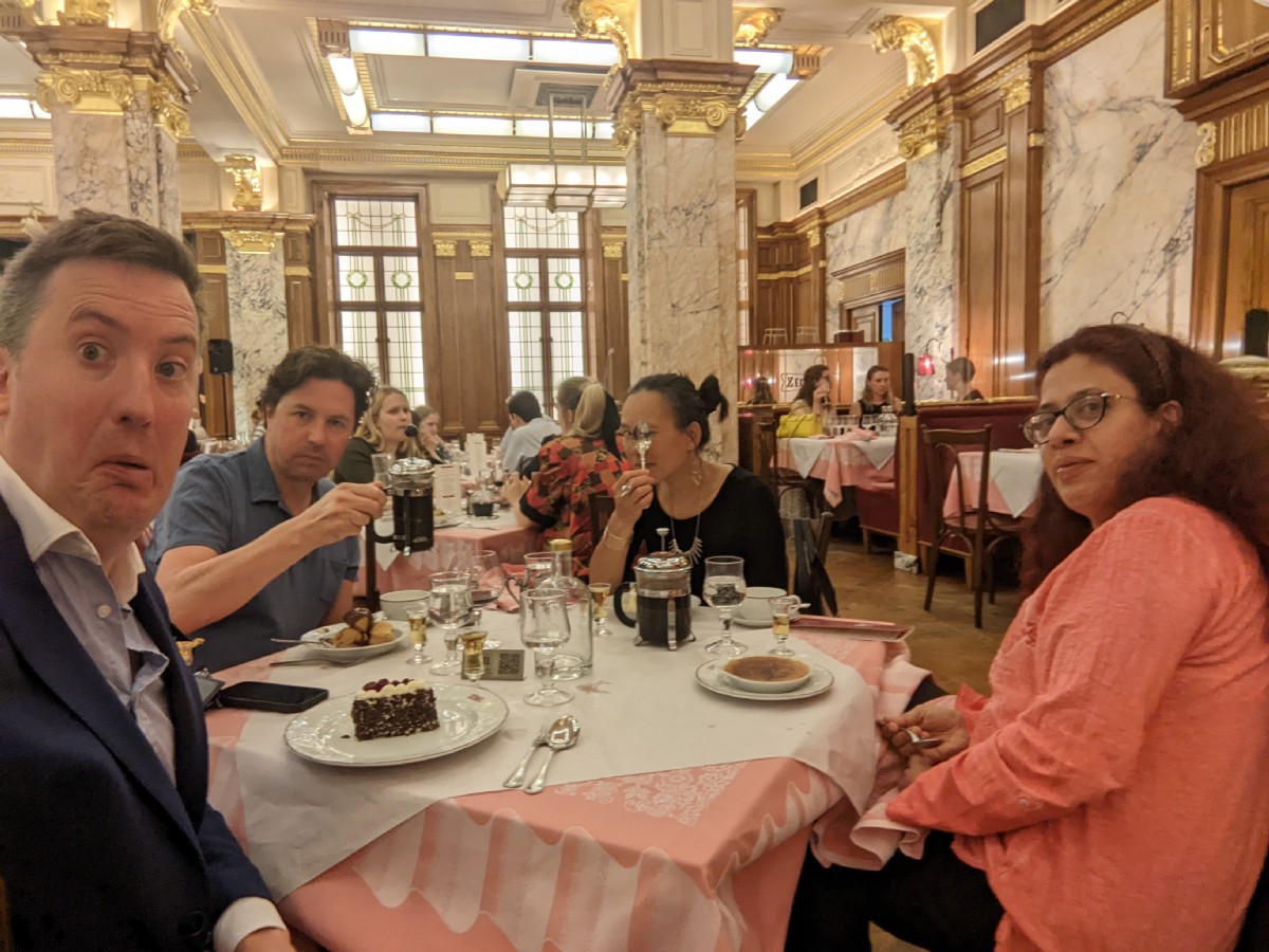 18:33:28 Ended with Black Forest Gateau. A German cake in a French restaurant to round off a very British day. I'm sure there's something poignant about that or something. | 18:33:40 One final photo of the table I think my dining companions might have been happier without. |