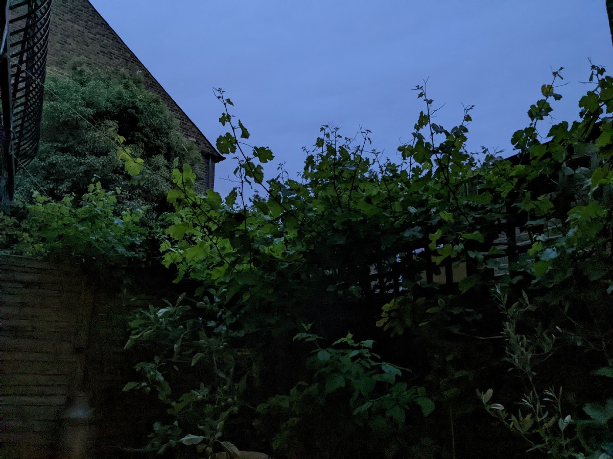 21:07:51 Also the fresh variety - foul moukala. | 21:49:25 Out in the back garden in the gloaming. | 22:20:15 I decided to set up a tarp so I could continue to sit out in the rain, and enjoy the pitter patter sound. |