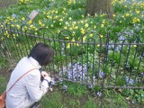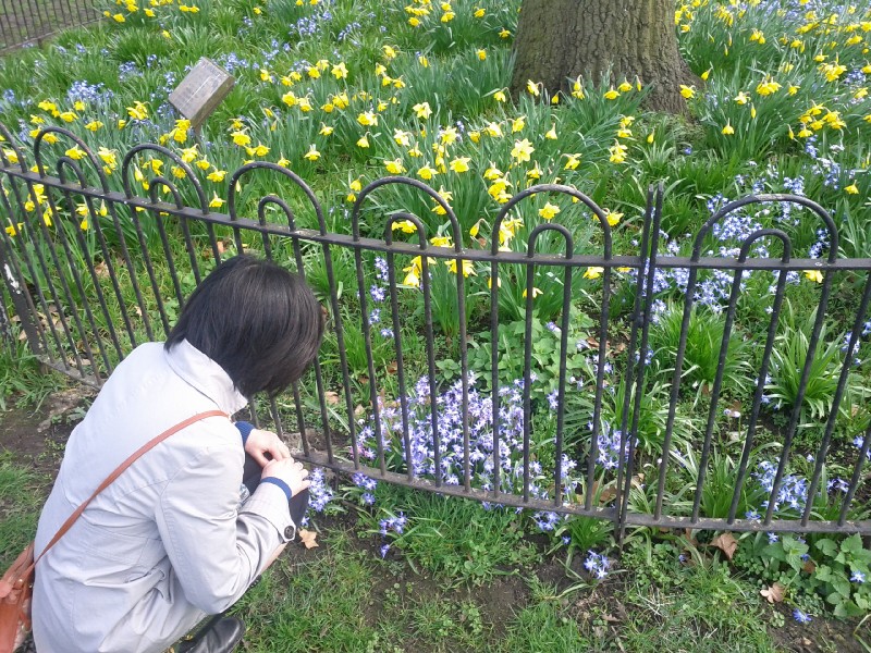 | 13:18:34 Chie inspecting some flowers in Battersea park. | 14:29:06 My lunch at the Westbridge Draft House - a very respectable macaroni with herbs and mushrooms. Note also the excellent chips, just visible in the top right hand corner. | 15:14:13 Somewhat incongruously they had He-Man wallpaper in the stairwell leading down to the toilets. |
