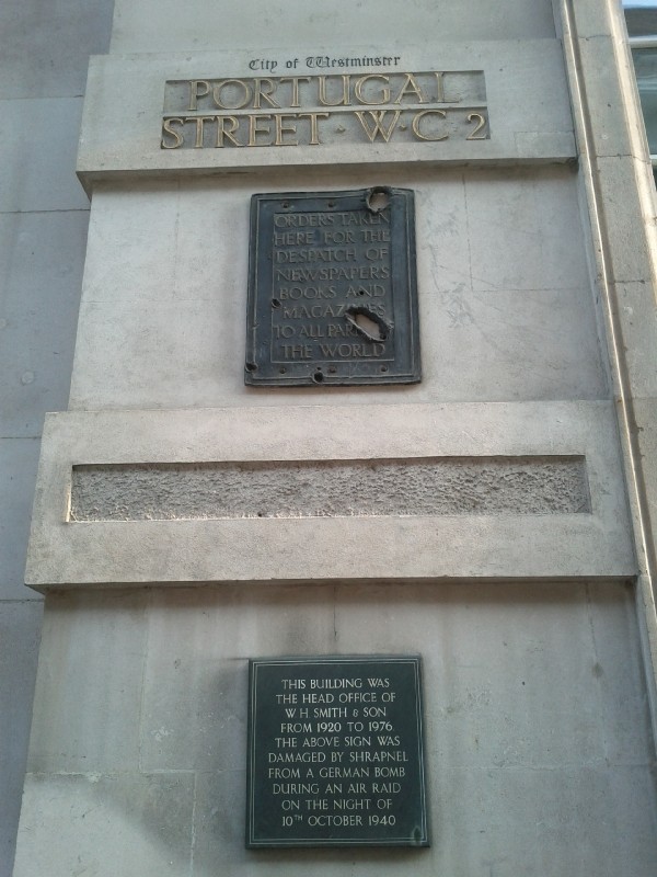 | 16:56:12 Evidence from yesterday's protests yesterday. | 17:11:05 Signs on the corner of Portgual Street - apparently this building was the head office of W H Smith. | 17:14:54 Outside the Seven Stars now - and the famous paw of Tom the pub cat on the sign. |