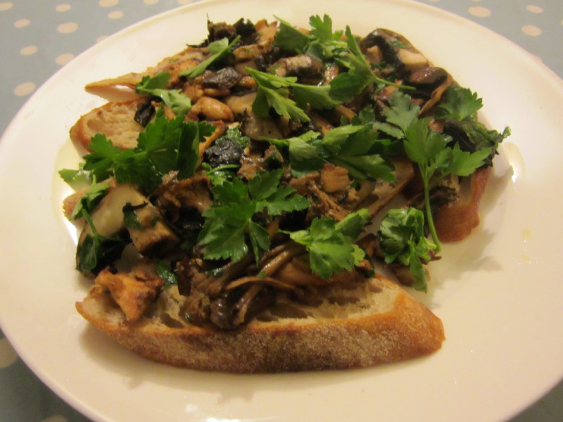 17:35:31 The bianchetto truffle I bought in Borough market. | 17:35:41 Also referred to as a white spring truffle. It's from Umbria. | 18:59:41 For starters I made some wild mushroom bruschetta, and went a bit overboard with the parsley. | 18:59:50 |