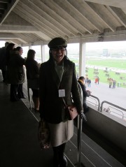 09:26:28 On the coach as it was leaving London - this seemed like an appropriate thing to take a picture of. | 12:27:21 Chie in her tweed outfit shortly after arriving at Cheltenham Racecourse. | 12:27:42 Me and Chie, taken by a stranger. | 12:41:28 Me with a foggy racecourse behind me. |