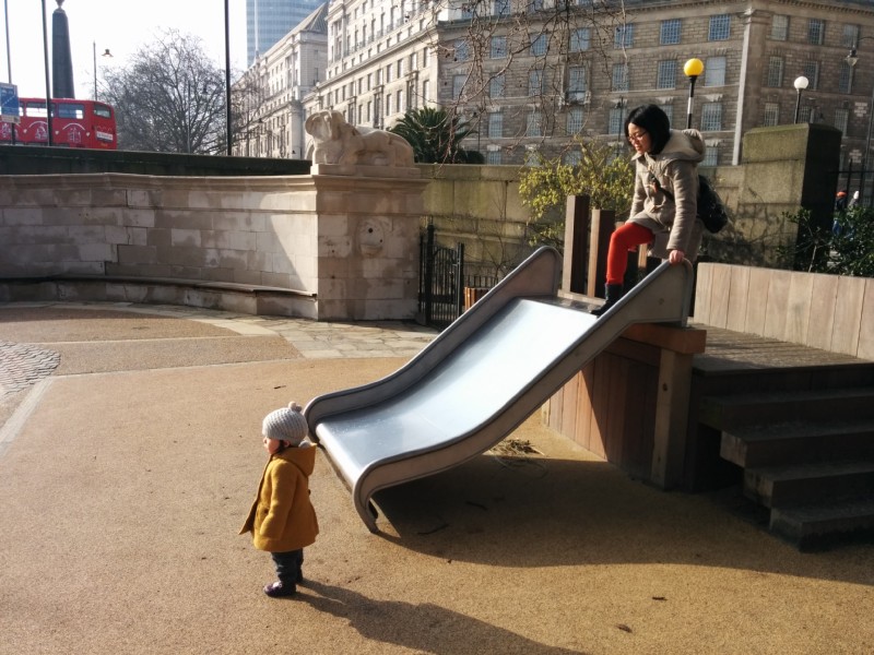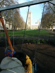 09:28:28 | 09:44:56 The lovely little children's play area in Victoria Tower Gardens, next to the Houses of Parliament. First the tyre swing. | 09:45:30 Note the view in the background. | 09:49:23 Erika's footprints in the sandpit. |
