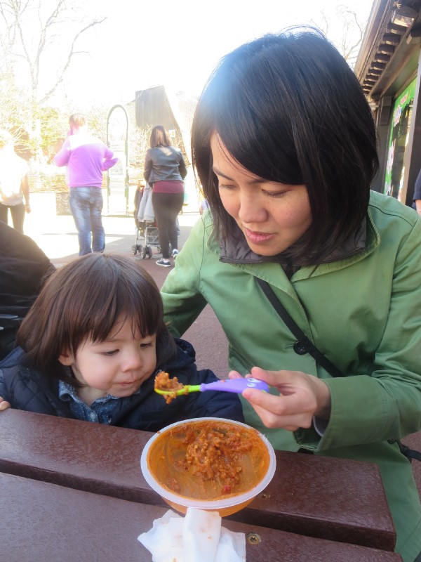 12:27:14 | 12:52:11 Erika having her lunch. | 13:47:00 The penguin pool - Erika had fallen asleep by this time so we decided to come back later. | 14:52:09 Strangely there's a lift that goes down into the rainforest area. Quite bizarre to see rainforest through a window in a lift! |