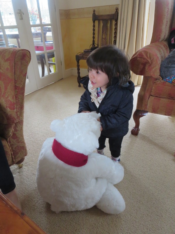 13:50:40 Erika in the car again. She rather liked it. | 17:30:33 Erika and a polar bear. | 17:32:09 Chie and Erika with Ali and his family on the doorstep as we were leaving. | 18:29:28 We had a quick burrito in Kings Cross for dinner on the way back. |