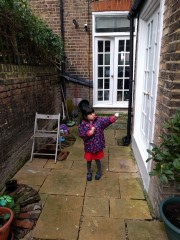 13:43:04 First sign of impending blossom on the little cherry blossom tree. | 13:44:08 Erika blowing bubbles in the garden. | 13:44:14 | 13:44:18 |