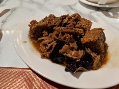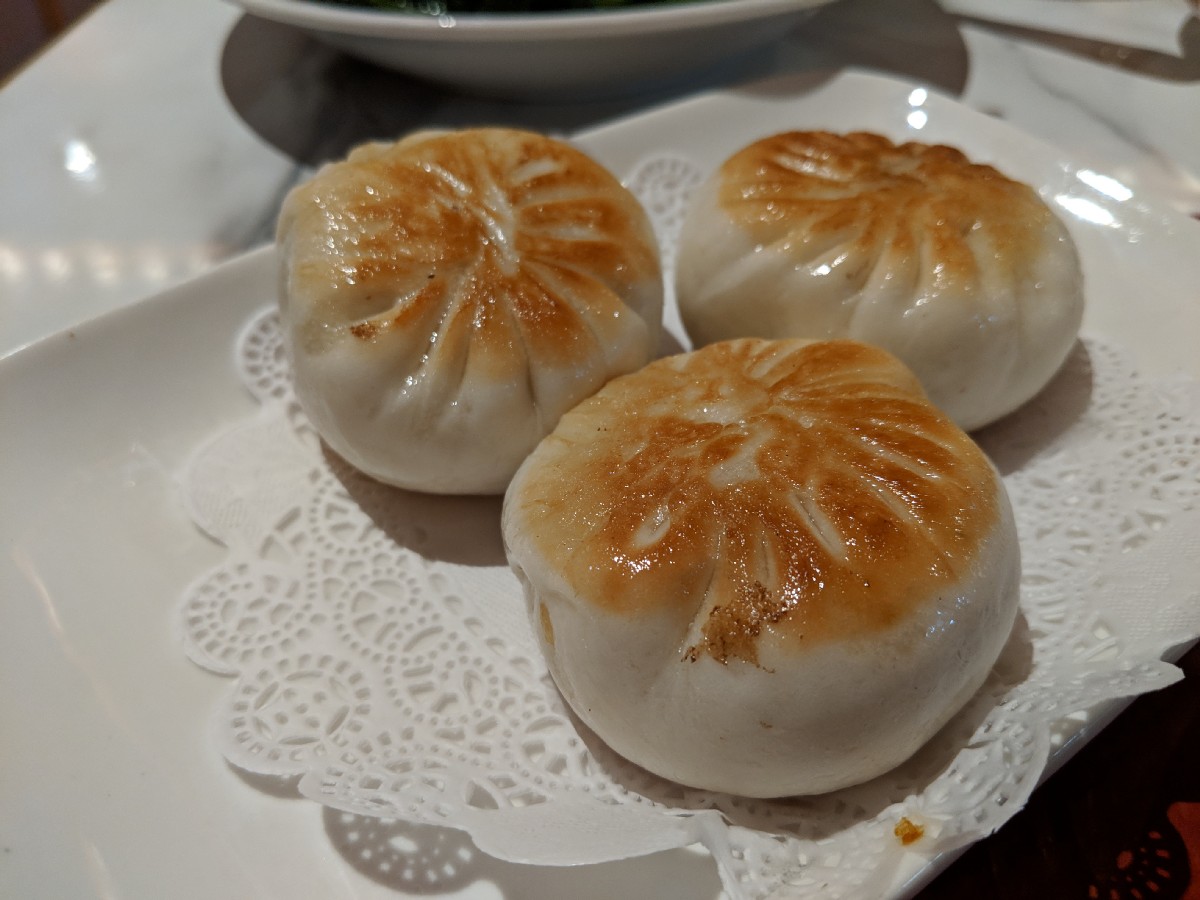 14:04:09 This cold spicy cucumber dish was surprisingly good. A bit reminiscent of kimchi. | 14:04:45 Not even quite sure what this was from the description in the menu (bran?) but it was apparently vegetarian and was quite nice. | 14:06:34 Kai lan good as always. | 14:09:49 The first set of dumplings they brought for me, which turned out to be the wrong ones. |