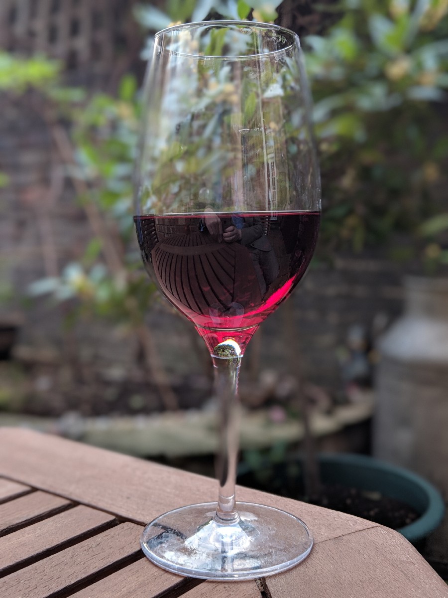 14:31:03 Quickly visited one of the nearby playgrounds after lunch. Erika on the monkey bars... | 14:32:17 ...and on the swings. | 14:33:30 | 17:37:36 Glass of Burgundy in the garden before dinner. |