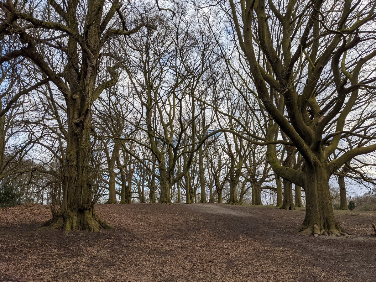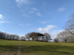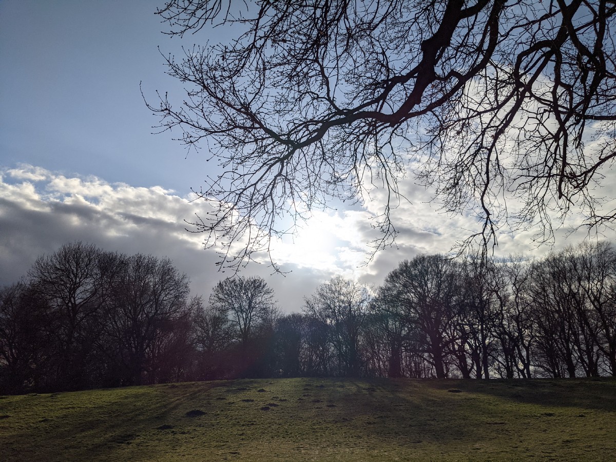 14:45:55 On arrival on the heath. A bit grey to begin with, but it improved later. | 14:46:03 Chie came with me as far as Parliament Hill, then went back to pick Erika up from school. | 14:53:28 Some kind of (prunus family?) blossom. | 14:55:00 The barrow, looking rather lovely with the suddenly blue skies. |