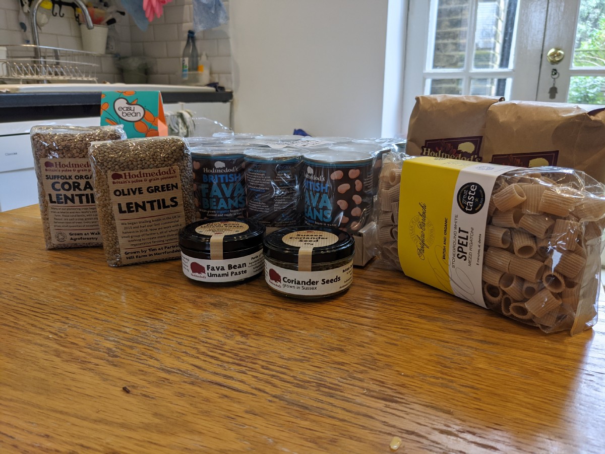 09:53:57 12 cans of organic British fava beans. | 09:58:17 The entire set of things I bought, including Sussex coriander seed, lentils and pasta all grown in the UK. | 09:59:22 | 18:03:47 I cleared out some space in this cupboard to fit it all in. |