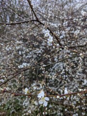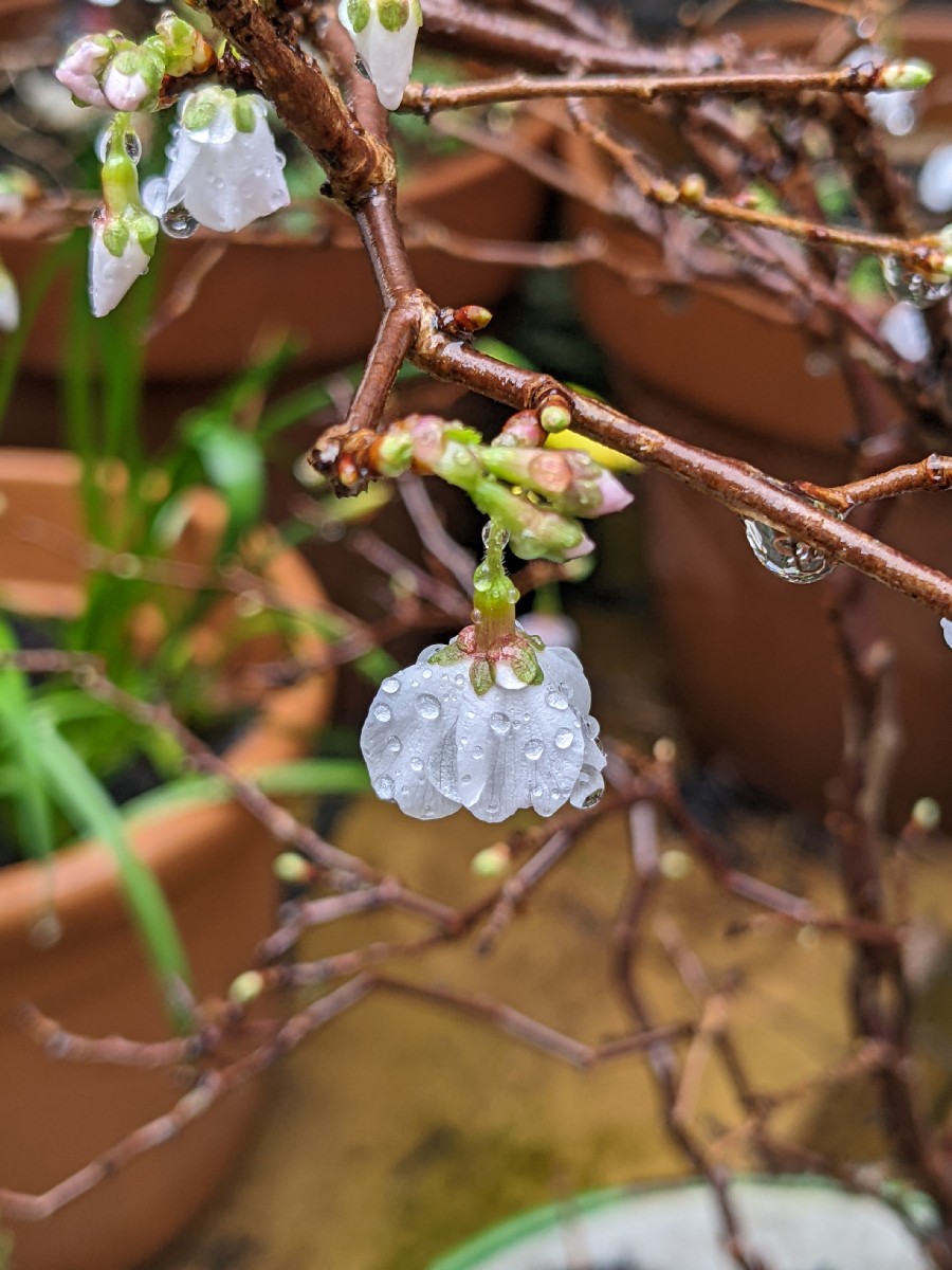 12:30:47 Checking in on the cherry blossom. | 12:30:54 I think they look nice when covered in raindrops like this. | 12:31:20 First daffodil! | 16:55:07 Wild cherry on the heath. |