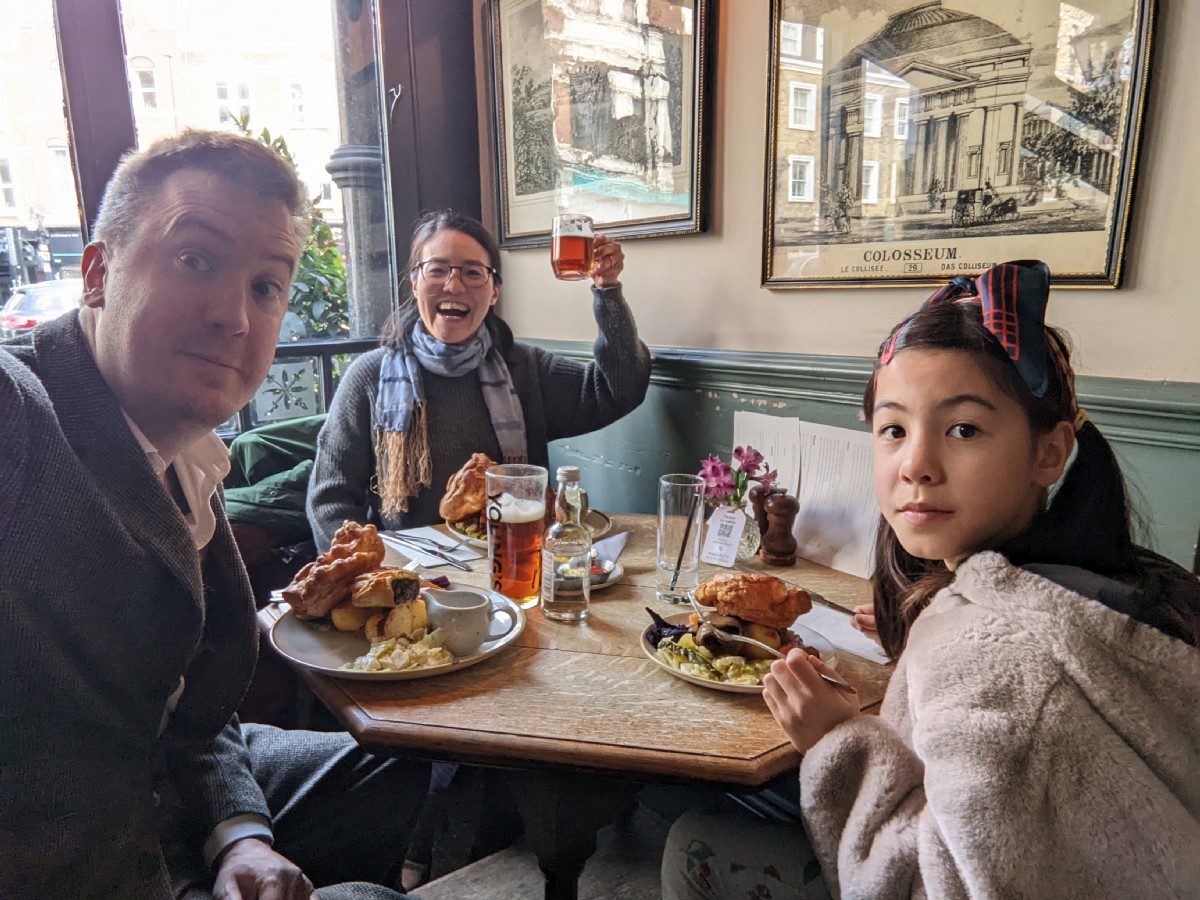 13:01:54 The periwinle in our front garden (I think). | 13:22:00 At the Bull and Gate. It has some nice pictures on the wall, but for some reason I've never really liked it here. | 13:33:48 We thought we'd try out their Sunday roast today. It was OK I guess, a bit overpriced though, and the centrepiece of the vegetarian version was a bit naff. | 13:34:16 Close up on the vegetarian Sunday roast. |