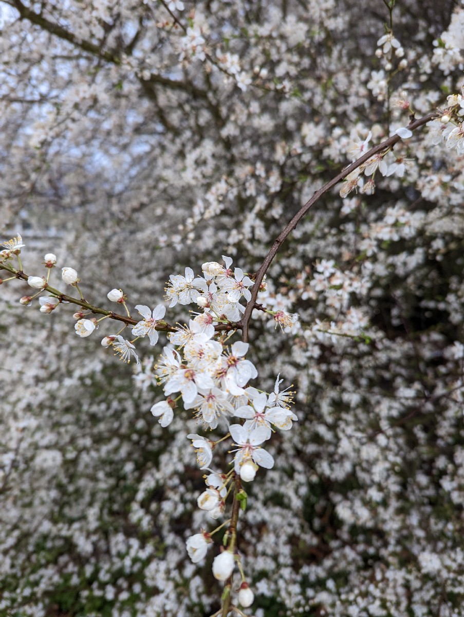 08:31:43 The cherry blossom near home with nice blue skies behind it in the morning. | 13:58:31 Later on, a video of a sudden flurry of hail. | 16:57:56 Later still, blossom on Hampstead Heath. | 16:58:02 |
