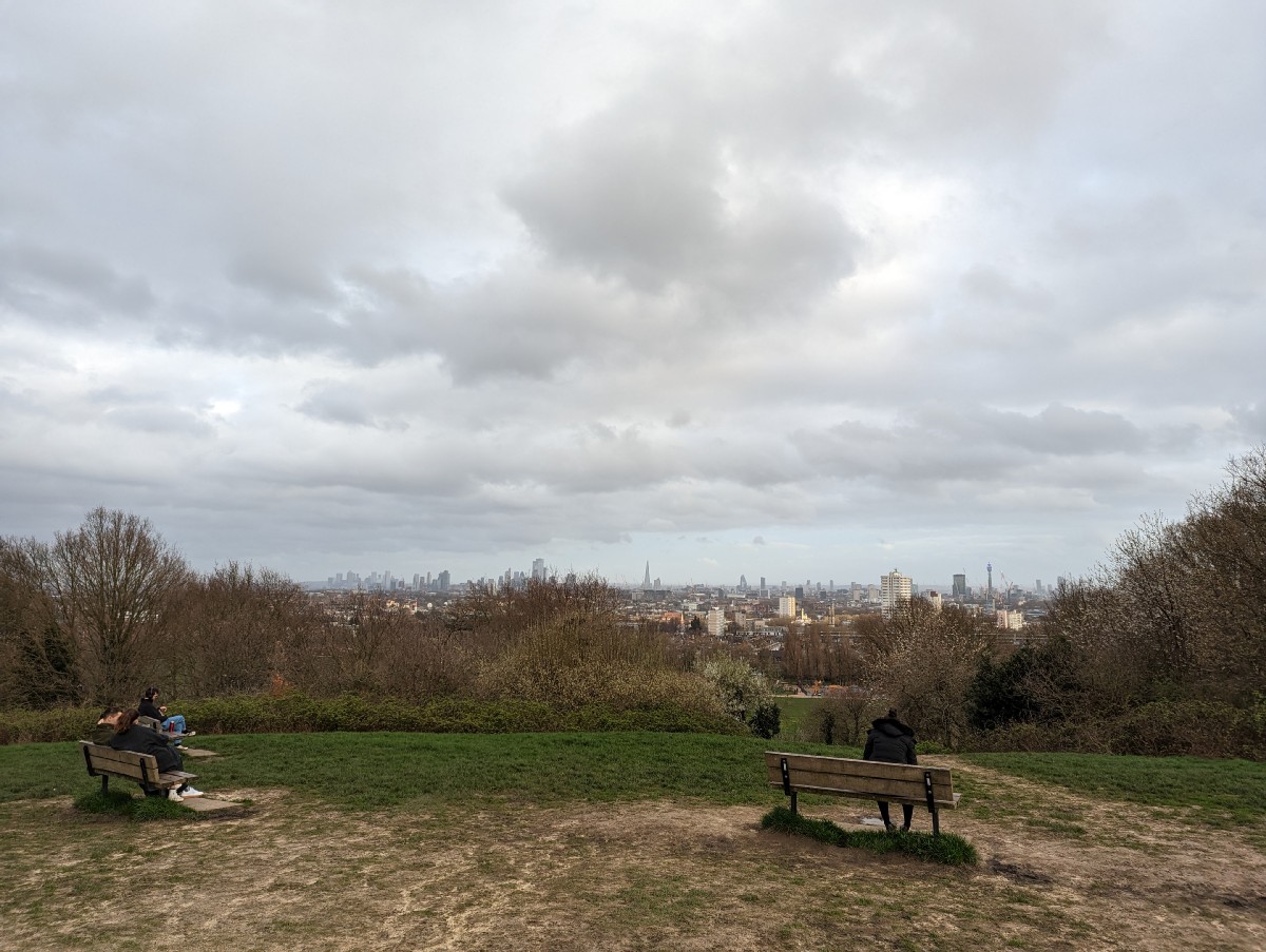 18:11:59 Top of Parliament Hill. | 18:14:56 Picked this up at one of the shops near the heath (in fact the oyster bar on Swain's Lane). It was supiciously cheap for English sparkling, and it turns out the reason why is that it's made with non-Champagne grapes. It was OK but I probably wouldn't bother again. | 18:17:06 The view from where I was sitting. | 18:17:09 |
