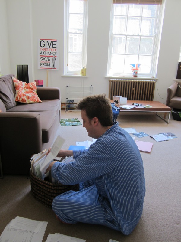 In my pyjamas tidying up the flat.