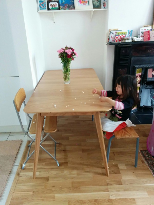 09:59:08 Bought some gozleme (Turkish filled flat bread) at a little Turkish bakery near Archway. | 11:01:25 Finally our dining table arrived! | 11:07:25 Erika helpfully spread small bits of polystyrene around on the new table. | 11:07:28 |
