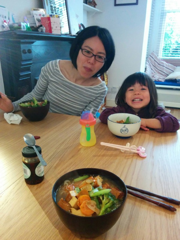 Chie and Erika sitting at the new dining table, we're having ramen for lunch.