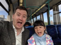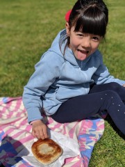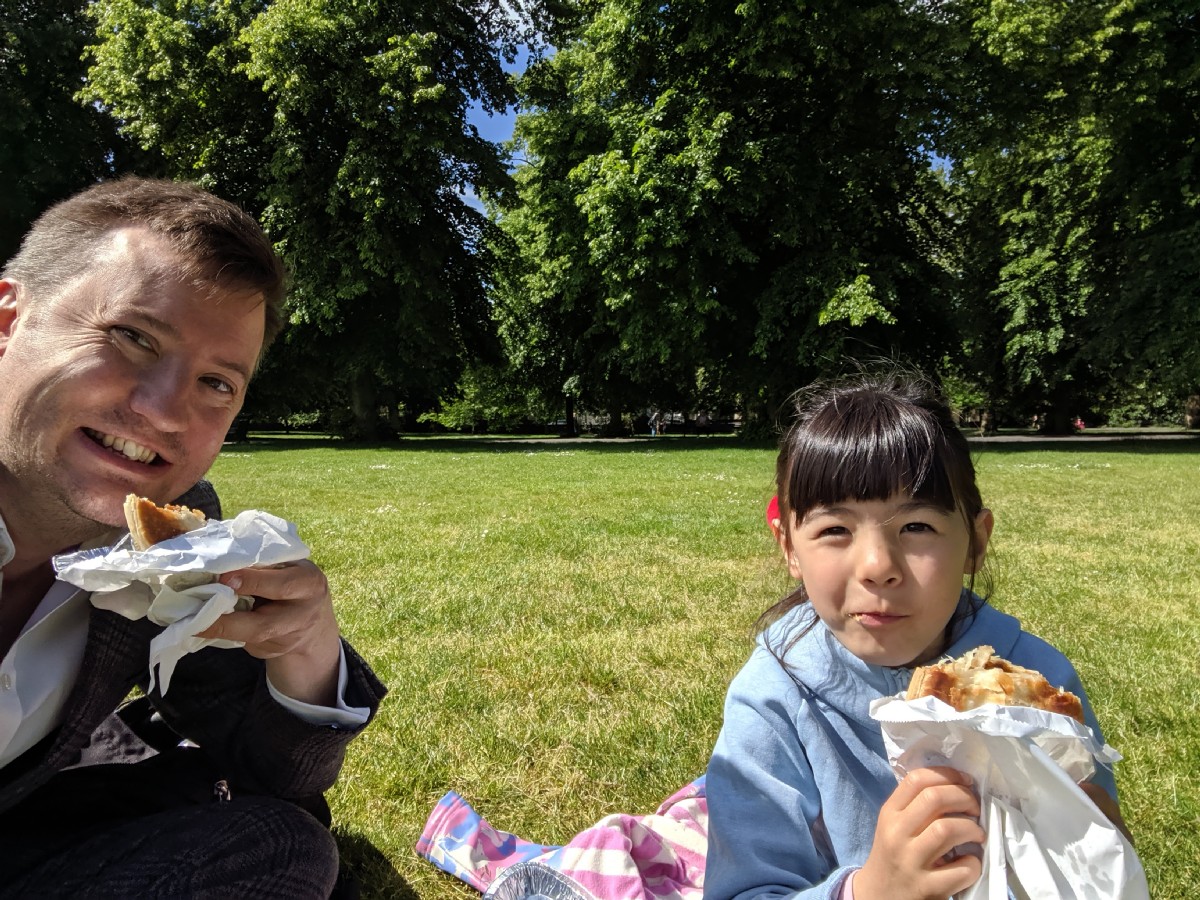 10:08:48 On the DLR on the way to Greenwich. | 10:33:20 Erika in Goddard's pie shop on arrival in Greenwich. | 10:43:47 Sitting in the park having an oddly timed mid morning pie. | 10:46:02 Me and Erika with our pies. |