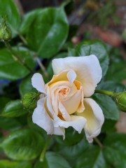 The rose bush blooming finally.