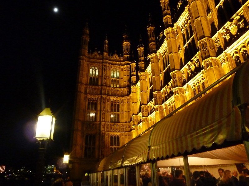 | 17:47:10 On the way to the House of Lords - the Tate Britain had this neon sign on the front... | 17:47:21 ....unfortunately very hard to get a clear photograph of it! It read something like "Everything is going to be alright". | 18:12:55 Chie out on the balcony of the House of Lords. |
