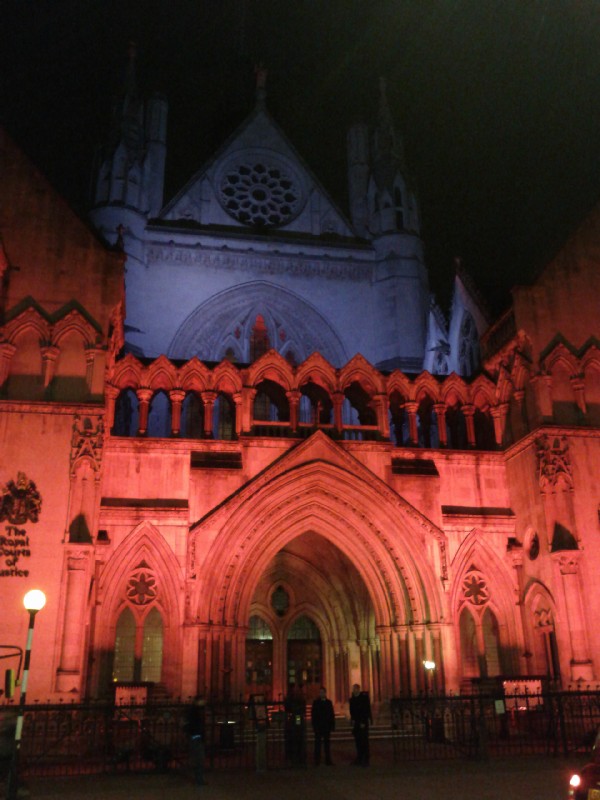 Picture of the Royal Courts of Justice bathed in an eery red light.