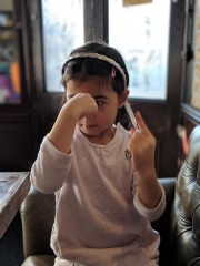 11:49:37 I was rather pleased with this multi coloured window in Erika's playhouse. | 13:14:02 Erika in the pub waiting for our lunch to arrive. | 13:16:59 Chie in the pub. | 13:17:22 Erika again. |