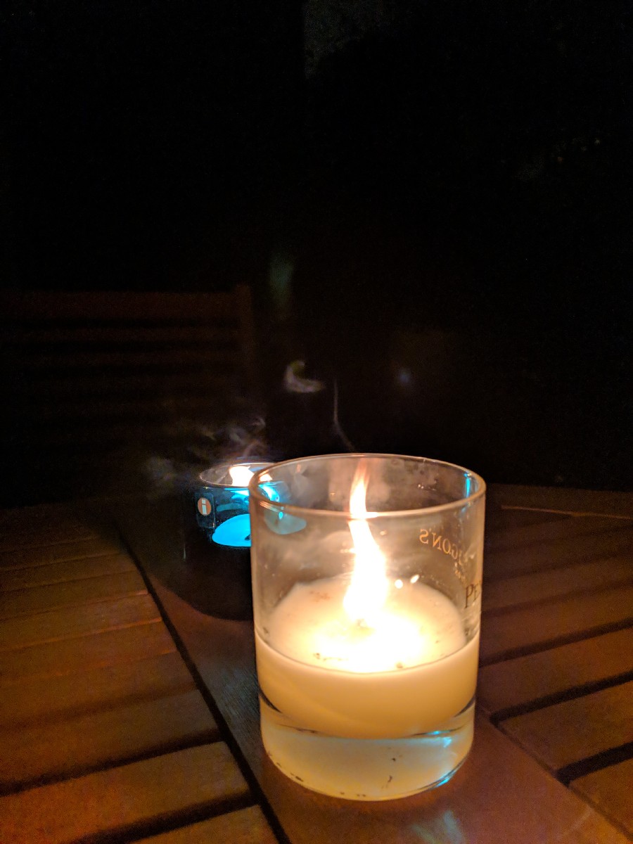16:17:57 Decided to clock off work early, it being a Friday, and went for a walk. This is College Lane in the twilight. | 17:02:52 Back at home, my attempts to illuminate the garden with candlelight. | 17:03:01 | 17:17:01 Using this storm lantern vase thing as an actual lantern. |