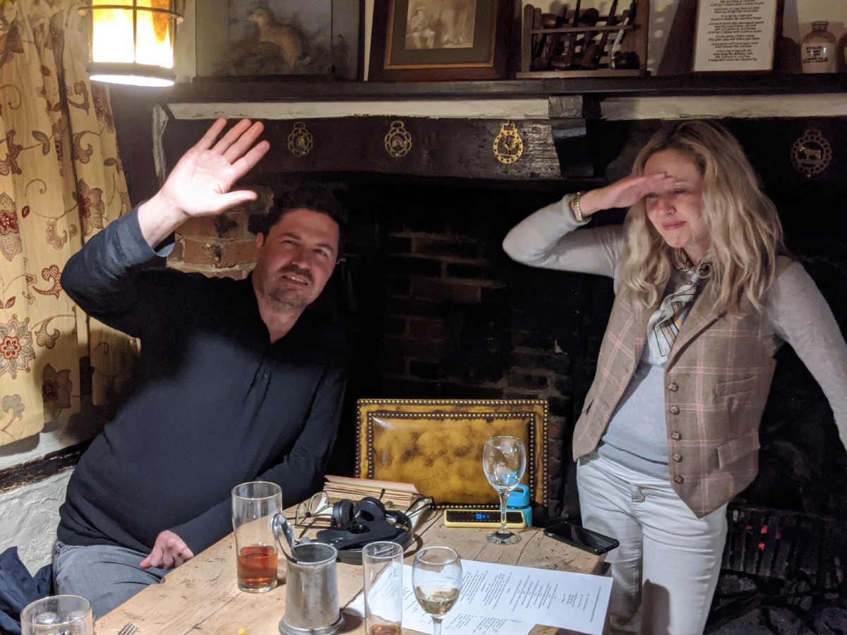 18:25:28 More exterior shots of the Royal Oak. | 18:26:02 | 18:29:20 Andrew and Corrie through the window of the pub. | 19:46:44 Although the Royal Oak is a very traditional pubby sort of a pub, they did have some local wines on offer, and having bumped into winemaker Dermot Sugrue in Waitrose earlier it seemed appropriate to have a bottle of his handiwork from Wiston Estate. |
