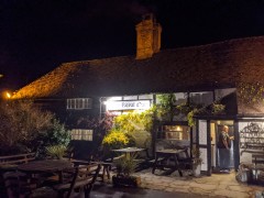 20:20:49 A bit of an in joke here - every year Andrew and I have a "quaint" pub outing in the run up to Christmas, and every year I search for an ever more perfect and idyllic pub only to have it receive a decidedly middling rating (typically 4/10) from Andrew because of some minor flaw. Here the achilles heel in this otherwise beautiful and unspoilt pub was this bright LED light (disguised as a lantern) above our table. | 21:21:30 Another exterior shot of the Royal Oak. | 21:21:57 I remembered my new phone had an astrophotography mode, so I had a go at taking a picture of the stars, but discovered it only really kicks in properly if it detects the phone is on a tripod. So this is just black with a few white dots. | 21:31:48 The fireplace. |