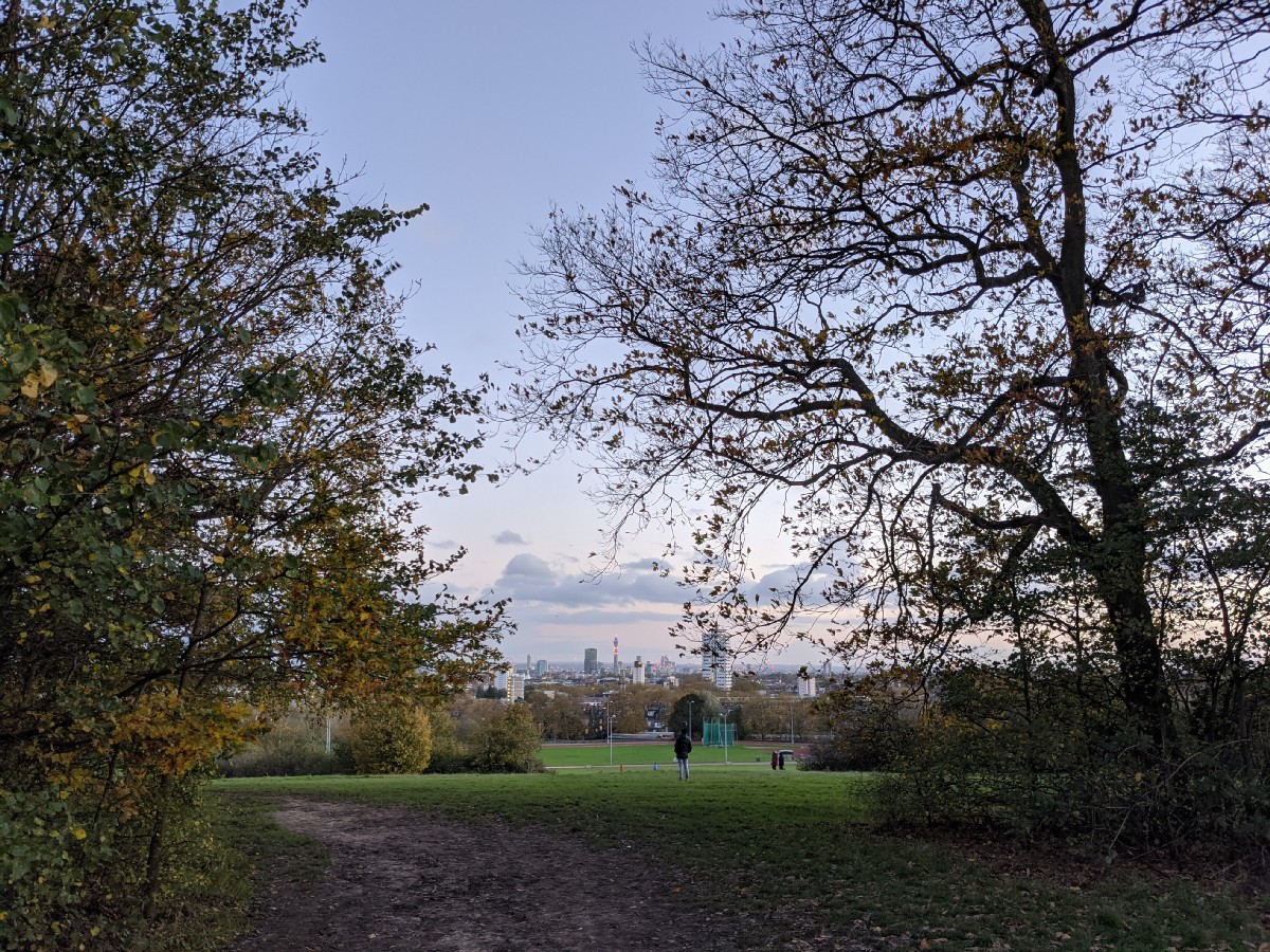 16:38:47 I think in fact the sun may have already officially set by the time I got to the heath, but there was a nice sky still regardless. | 16:39:02 | 16:41:31 Heading up to the top of Parliament Hill in the gloaming. | 16:42:53 Early evening view from the top of Parliament Hill. |