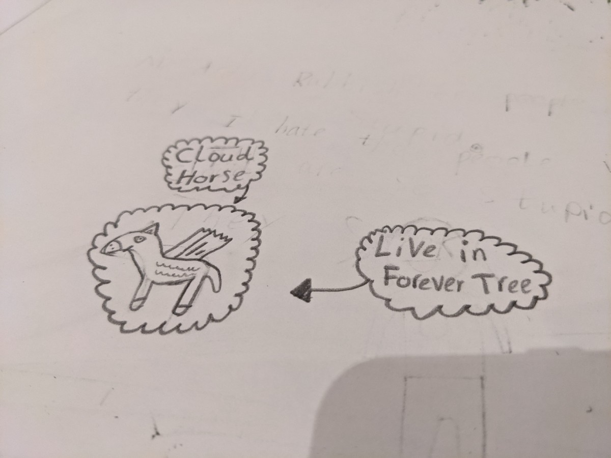 17:29:41 Erika and I did some drawing. Here's my very loose interpretation of Stonehenge. | 17:31:47 Erika drawing. | 17:33:15 My Stonehenge like monument again. | 17:40:16 Erika's cloud horse, who lives in the forever tree. |