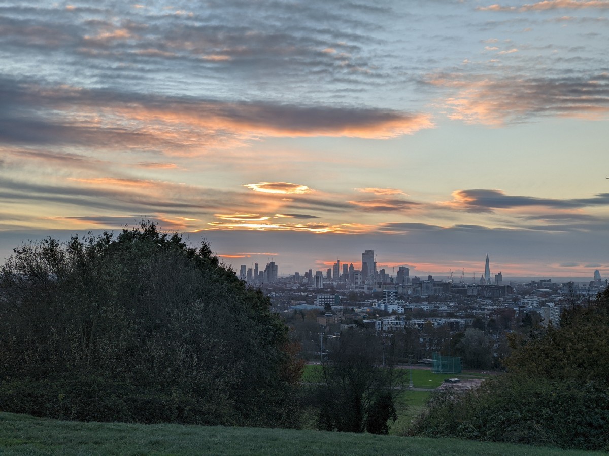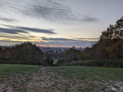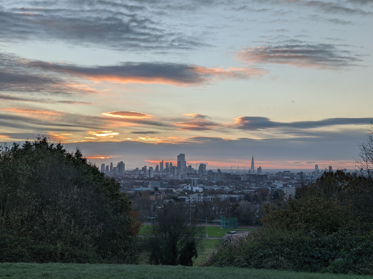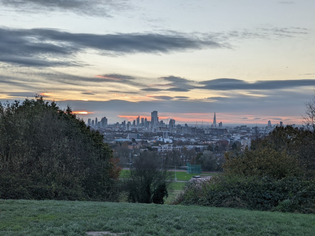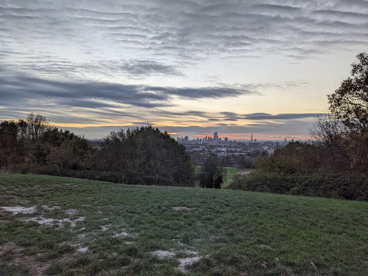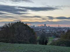 07:28:21 On arrival on the heath, a bit before sunrise, the view of the bandstand. Nice sky already. | 07:28:24 | 07:32:01 The top of Parliament Hill. | 07:32:04 Zoomed in a bit on the London skyline. |