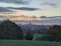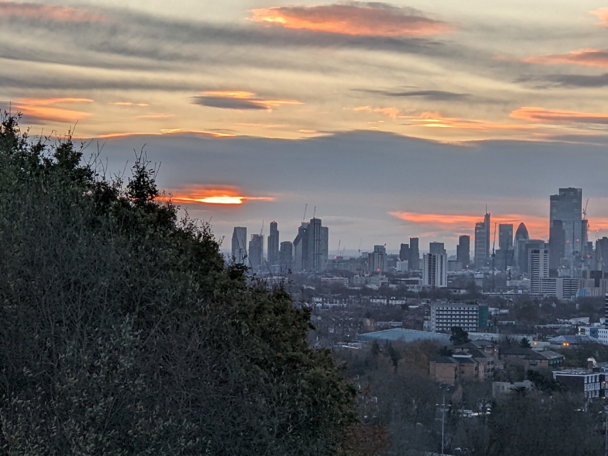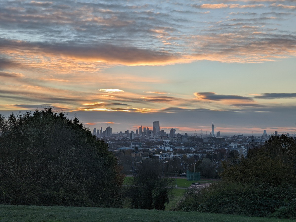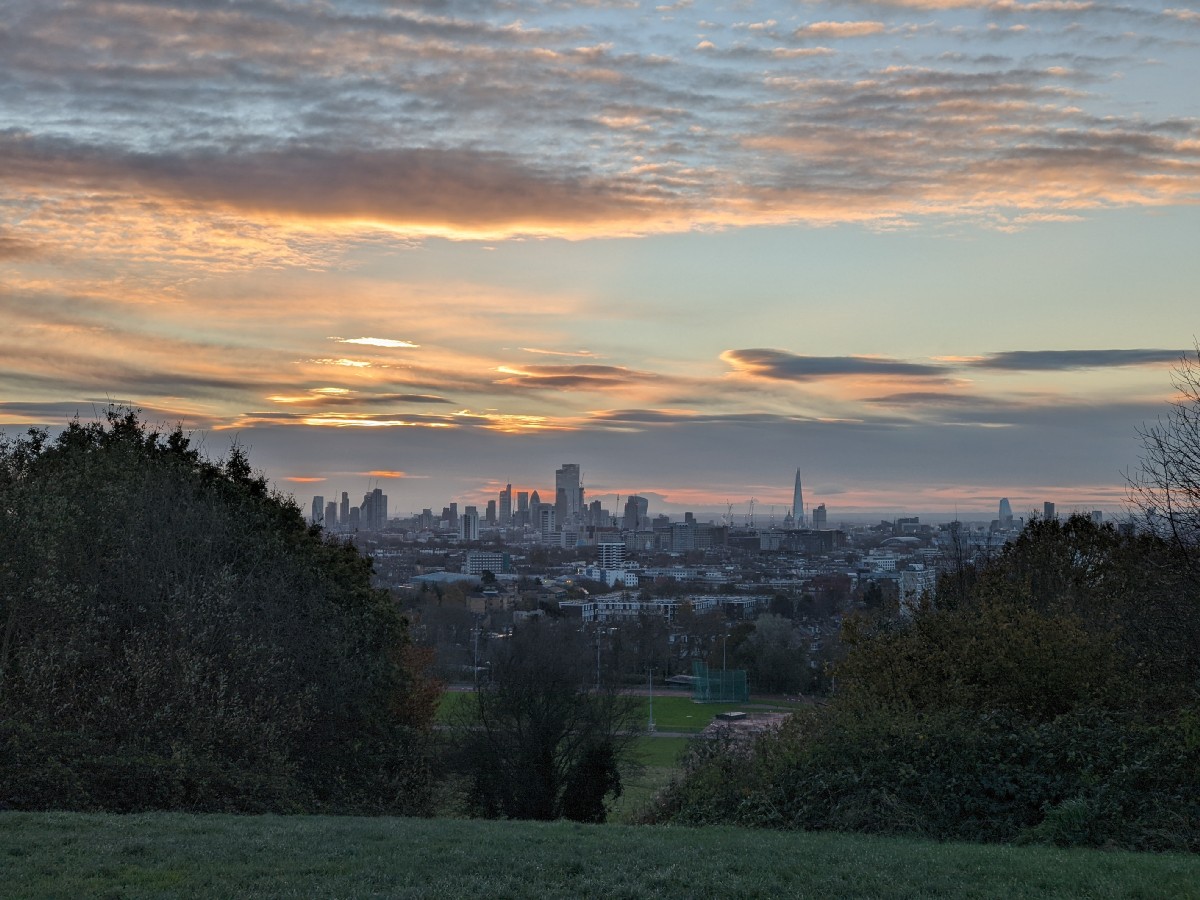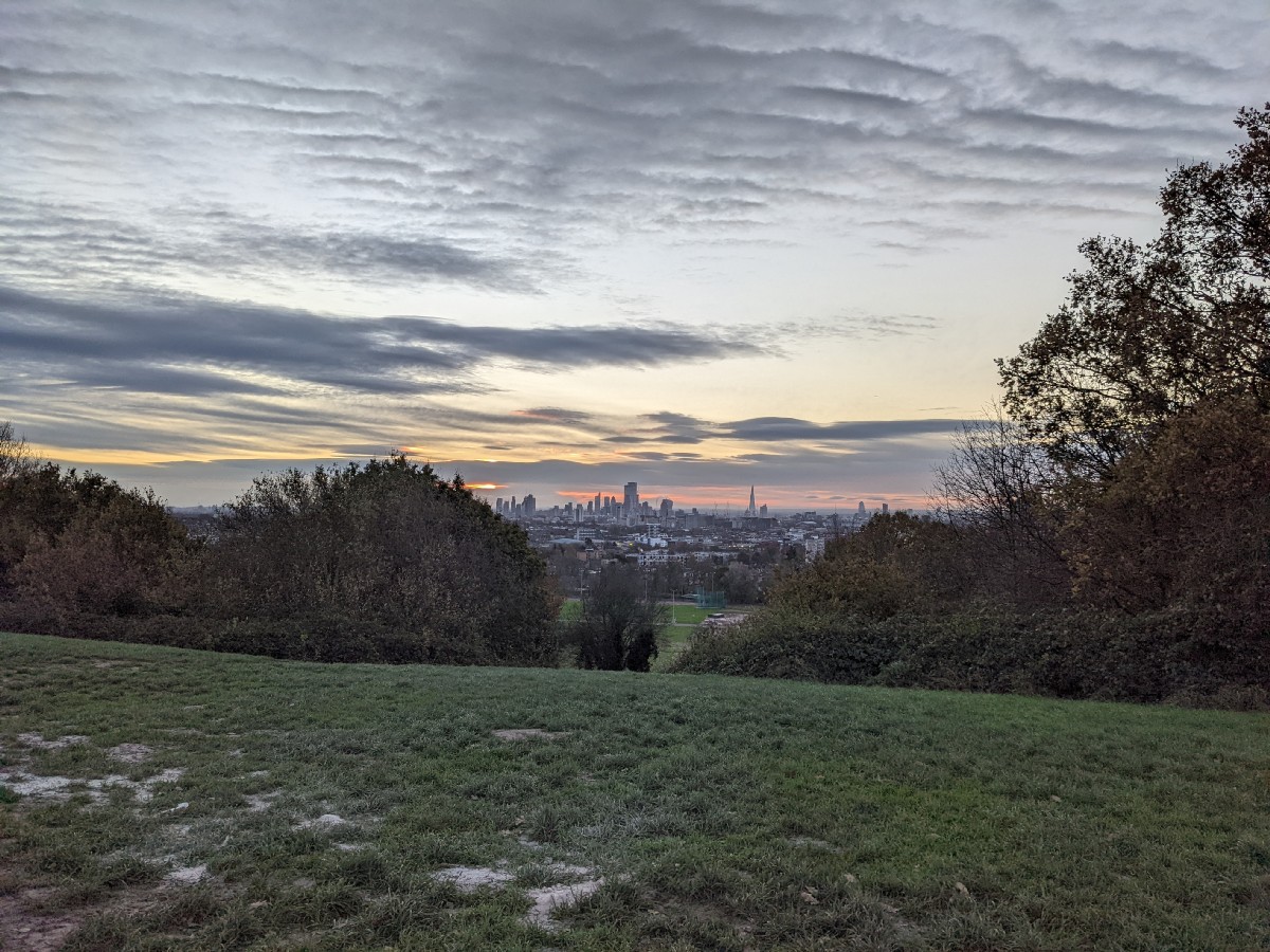 07:28:21 On arrival on the heath, a bit before sunrise, the view of the bandstand. Nice sky already. | 07:28:24 | 07:32:01 The top of Parliament Hill. | 07:32:04 Zoomed in a bit on the London skyline. |