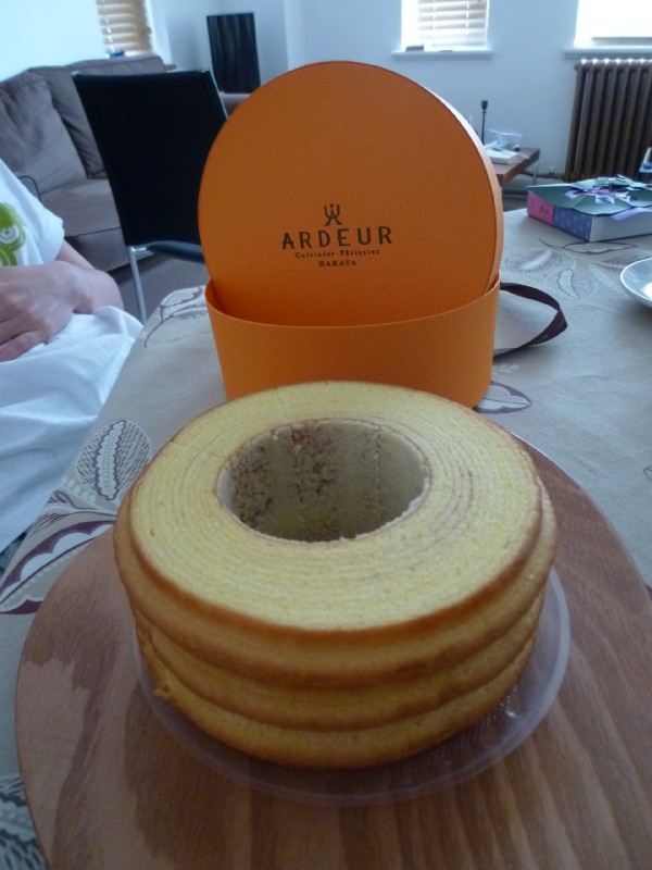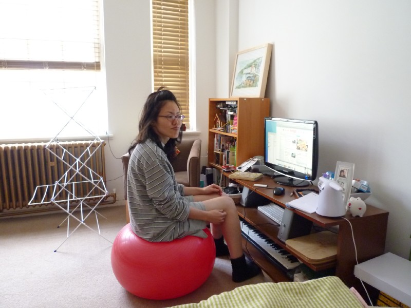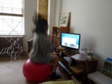 | 10:34:40 The baumkuchen I'd brought back from Japan for Chie. This was very nice. | 12:23:21 Chie on her balance ball. | 12:23:56 |