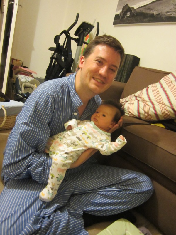 20:17:11 Chie holding Erika whilst nibbling on pizza. | 23:20:18 Me looking rather inane in my pajamas whilst holding Erika. | 23:48:58 Erika asleep on my lap after I cut her nails (they'd got a bit long and she'd scratched her face last night). | 23:49:29 |
