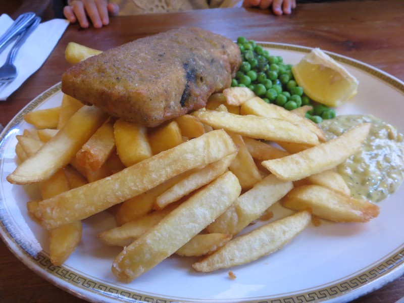 12:31:47 | 12:35:32 My roast meal. | 12:35:35 Chie's "tofush and chips". | 12:37:53 Erika shared a bit of ours and also had some of the veggie scotch egg. |