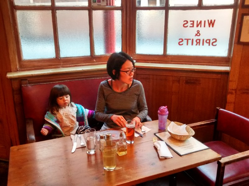 10:47:47 Took some clothes to be recycled this morning. This had been a favourite shirt for years but was well past its best as you can see. Was a bit sad to see it go. | 12:10:54 Erika and Chie in the Coach and Horses waiting for lunch. | 12:17:21 Some drinks. | 12:31:37 Jeff bin in? |