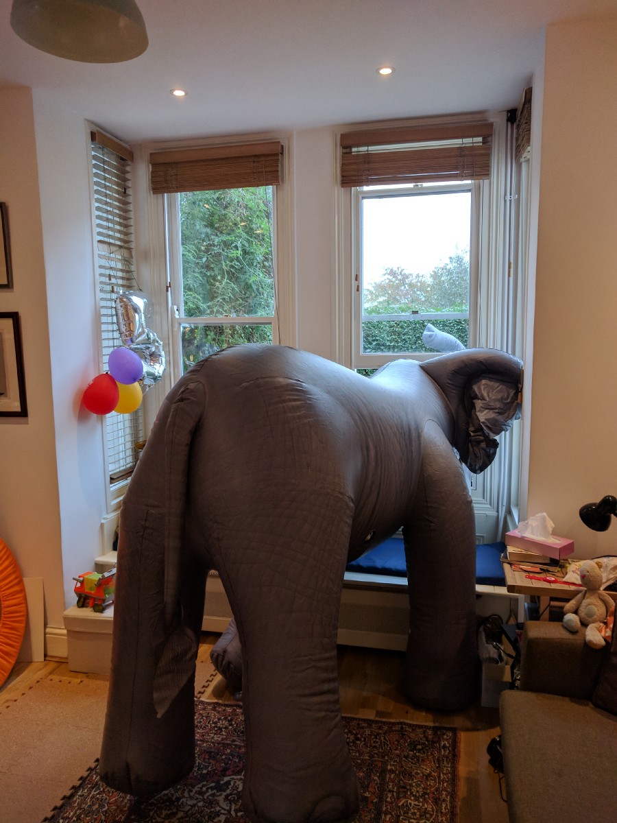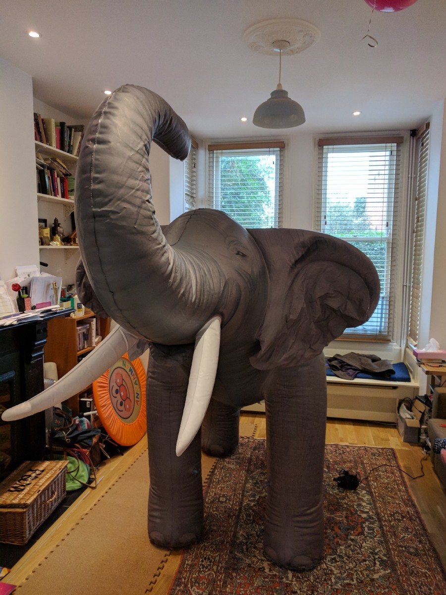 16:20:47 The elephant has been re-inflated! | 16:32:34 It took up rather a lot of space in the lounge. | 16:58:56 The elephant making a bid for freedom. | 16:59:26 |