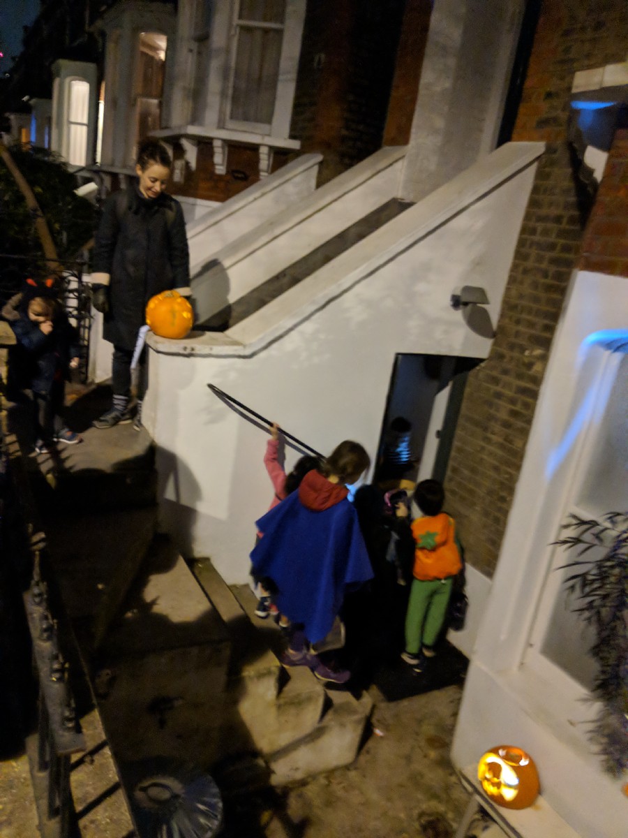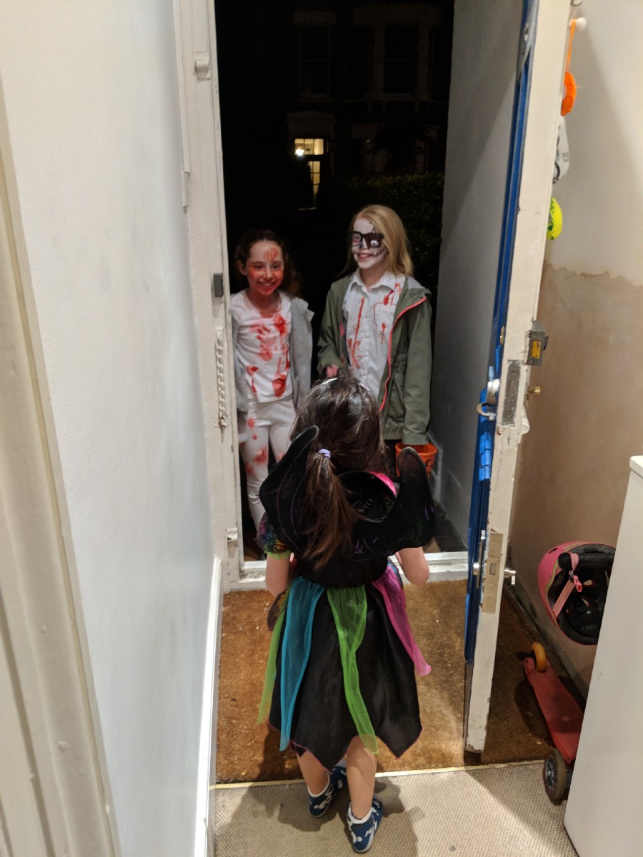 18:10:46 Erika and her friend Frances who stopped by for a bit. | 18:21:46 More trick or treaters. | 18:29:34 Erika and Frances. | 19:18:03 After we'd given all our sweets away I took Erika out to do a bit of trick or treating herself. |