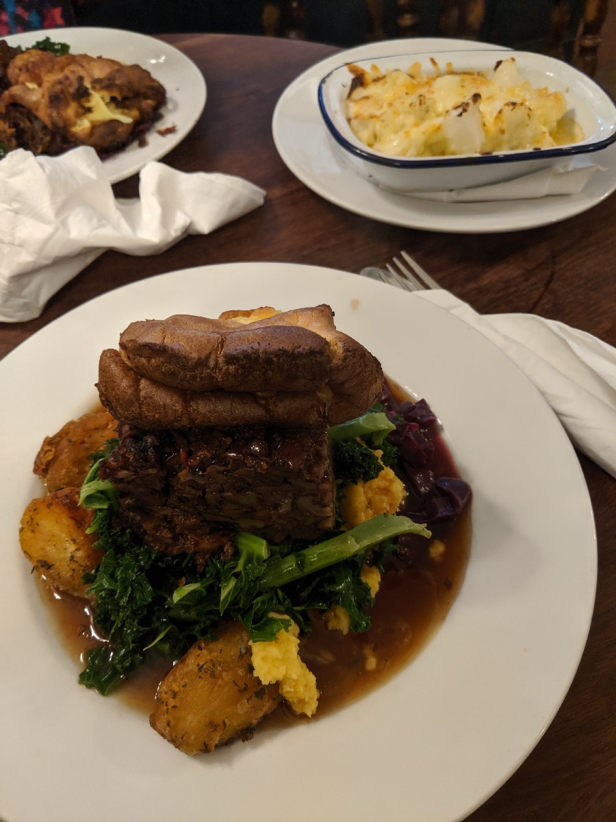 14:31:37 Having a drink while we waited for our lunch. | 14:41:30 Both Erika and I had the nut roast. Not sure Erika really likes roast meals much, but she did at least eat a fair amount of that cauliflower cheese.