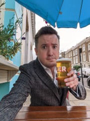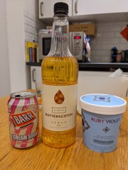 19:21:57 Erika with the finished product. I think the taste was pretty good - the butterscotch really dominates - but need to work on the appearance a bit. It did get a frothy head from the ice cream but the whole thing was very pale white - I had hoped it would look slightly more beery like the one they served at the Warner Bros studios. |