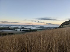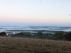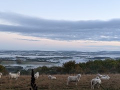 06:54:23 The moon at first light when I woke up. | 06:54:28 | 07:22:29 I loved the views of the misty fields down below around sunrise this morning. Particularly nice with this handful of sheep in the foreground I thought. | 07:22:44 Me and the misty views. |