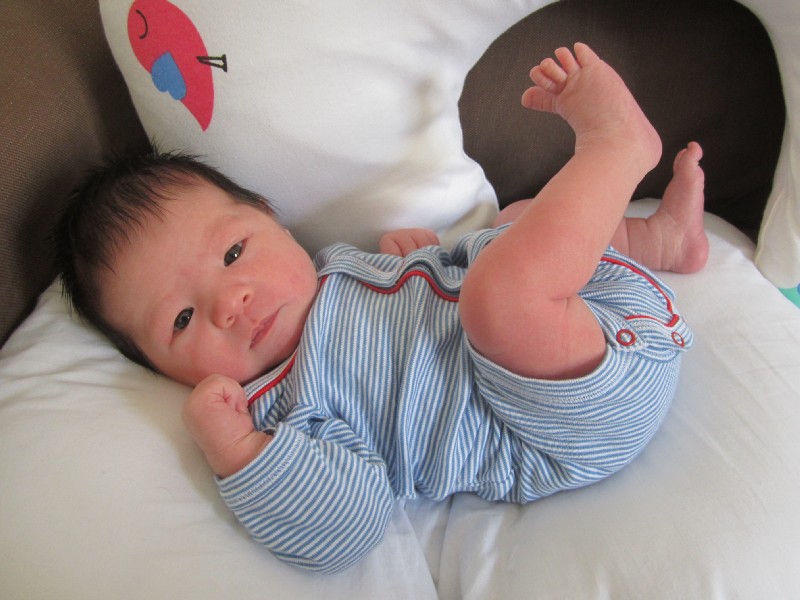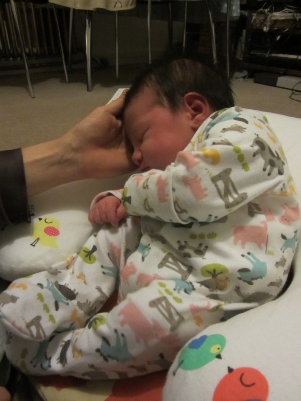 18:00:57 Chie wanted pizza for dinner, so we tried firezza. It was kind of disappointing to be honest. Really dry and salty. | 18:01:04 The free bread that came with it - similarly dry and salty. | 21:12:07 The new farm themed baby grow I'd bought yesterday in Peter Jones. | 21:17:18 Erika having a nap on my chest (don't worry I wasn't actually asleep here, just pretending). |