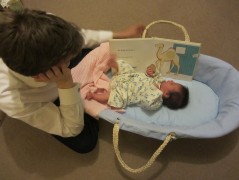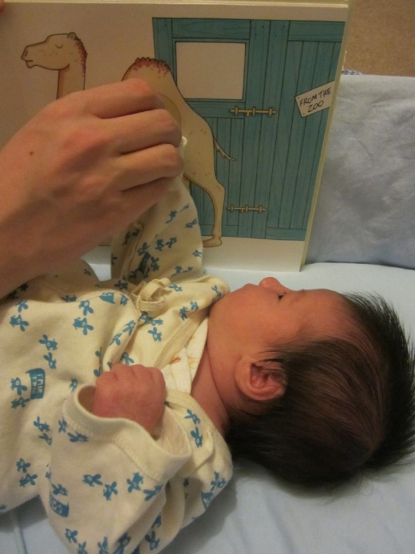 12:53:45 Erika with a frog rattle, a present from a colleague at work. | 13:32:38 Erika having a doze in the feeding cushion. | 20:34:27 Erika watche Poirot. | 21:19:21 Erika reading Dear Zoo, a present from Adrian and Liz. |