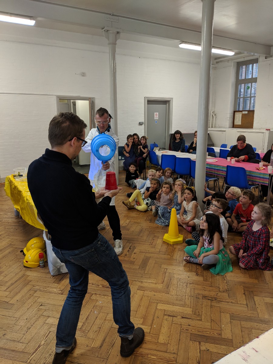 14:10:14 Another experiment. I think this was the thing with the exploding camera film boxes. | 14:12:53 The professor firing sweets into the crowd. | 14:45:46 Erika having a bit of cake after we'd tidied up. | 14:50:27 Lovely silly shot of Erika and Mum as we were leaving. |