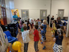 11:36:41 The entertainer setting up with "help" from Erika. | 11:36:54 DJ Erika on the turntables. | 11:50:52 "No washing up". They really understand the key value proposition. | 11:53:40 Mum reading Erika the latest instalment in the Landaviddy Fairy Stories while we waited for guests to arrive. |