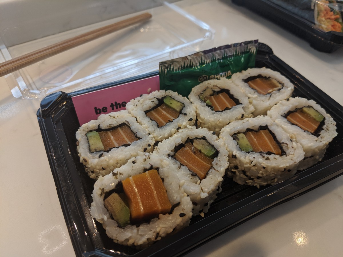 13:06:54 The vegan salmon maki sushi. | 13:07:01 ...and the vegan tuna and sweetcorn rools. | 13:07:48 I don't think it was at its best - the avocado was going a bit brown. | 13:10:35 The ingredients of the vegan salmon seem to be predominantly carrot. |